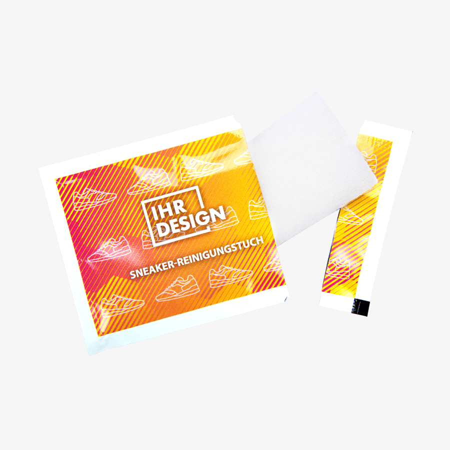 Ideal für Events, Promotion-Aktionen oder als Beilage im Handel sorgen sie unterwegs für eine schnelle und unkomplizierte Reinigung von Sneakern – besonders geeignet für Sohlen und glatte Oberflächen. Die einzeln verpackten Feuchttücher werden einseitig individuell bedruckt, sodass Ihr Logo oder Werbemotiv aufmerksamkeitsstark in Szene gesetzt wird.