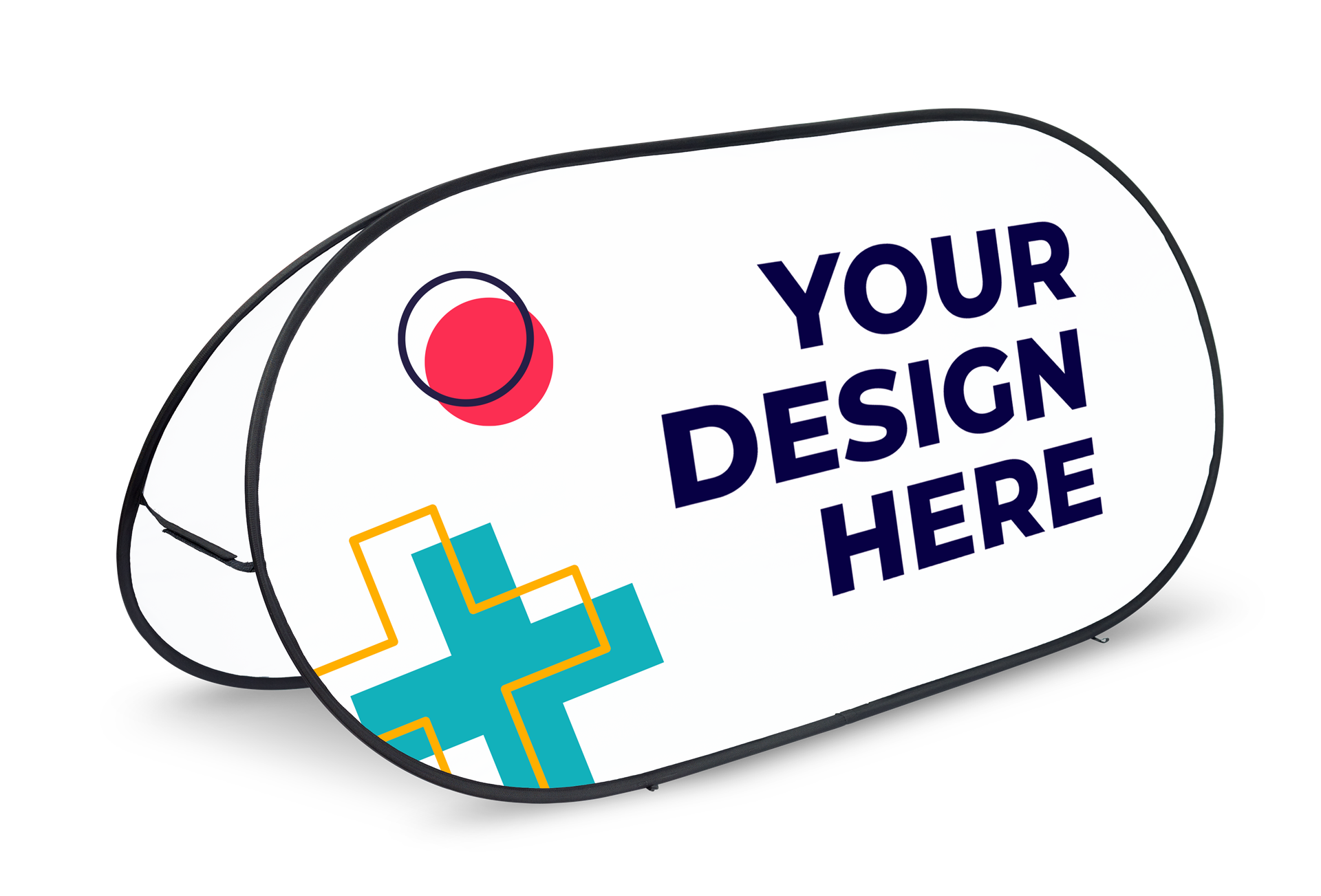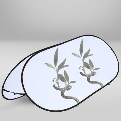 Horizontales Banner, beidseitig personalisierbar, faltbar mit Metallstruktur und Klettverschluss. Hergestellt aus 100% Polyestergewebe mit 115g/m² Sublimationsdruck. Mit Spikes zum fixieren.